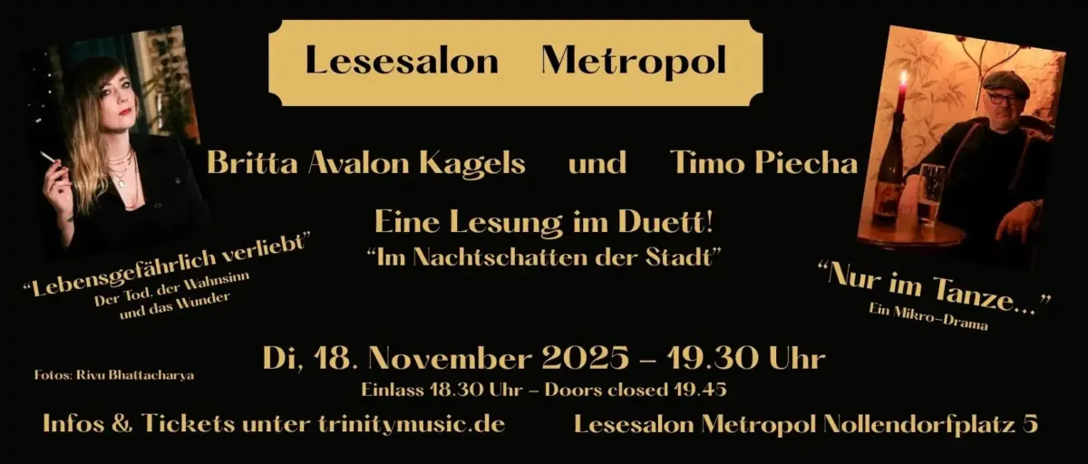 EventimSowohl Britta Avalon Kagels als auch Timo Piecha waren schon einmal erfolgreich zu Gast im Lesesalon Metropol und nun präsentieren sie ein gemeinsames Programm. Sie stellen uns zwei Geschichten vor, wie sie wahrscheinlich nur die Berliner Nacht hervorbringen kann.